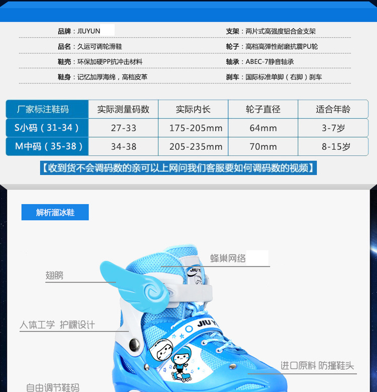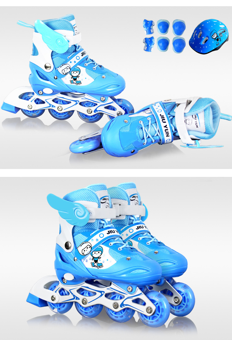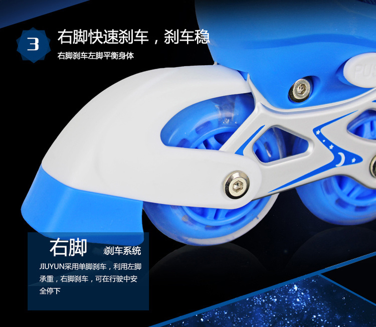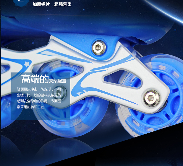 适用年龄: 普通轮子前轮单闪套装(鞋子+护具+大礼包),PU轮八轮全闪套装(鞋子+头盔+护具+背包+大礼包)