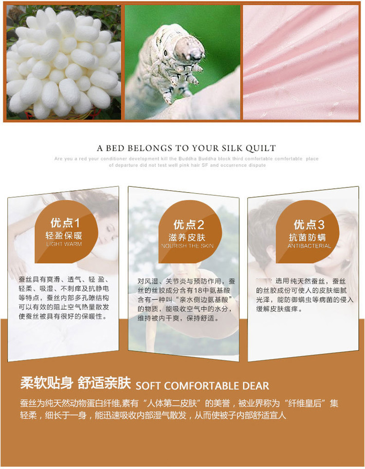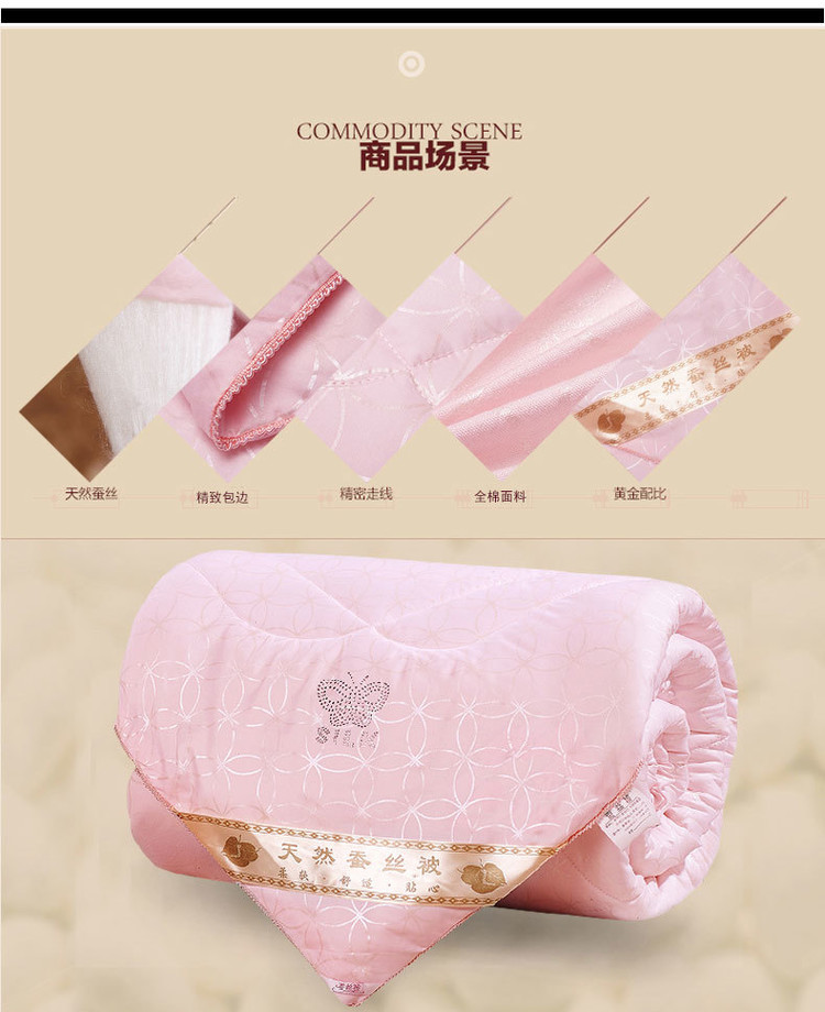 | 被里材质成分: 纯棉 | 填充物: 蚕丝 | 颜色: 白色,粉红色,米黄,玉色 |